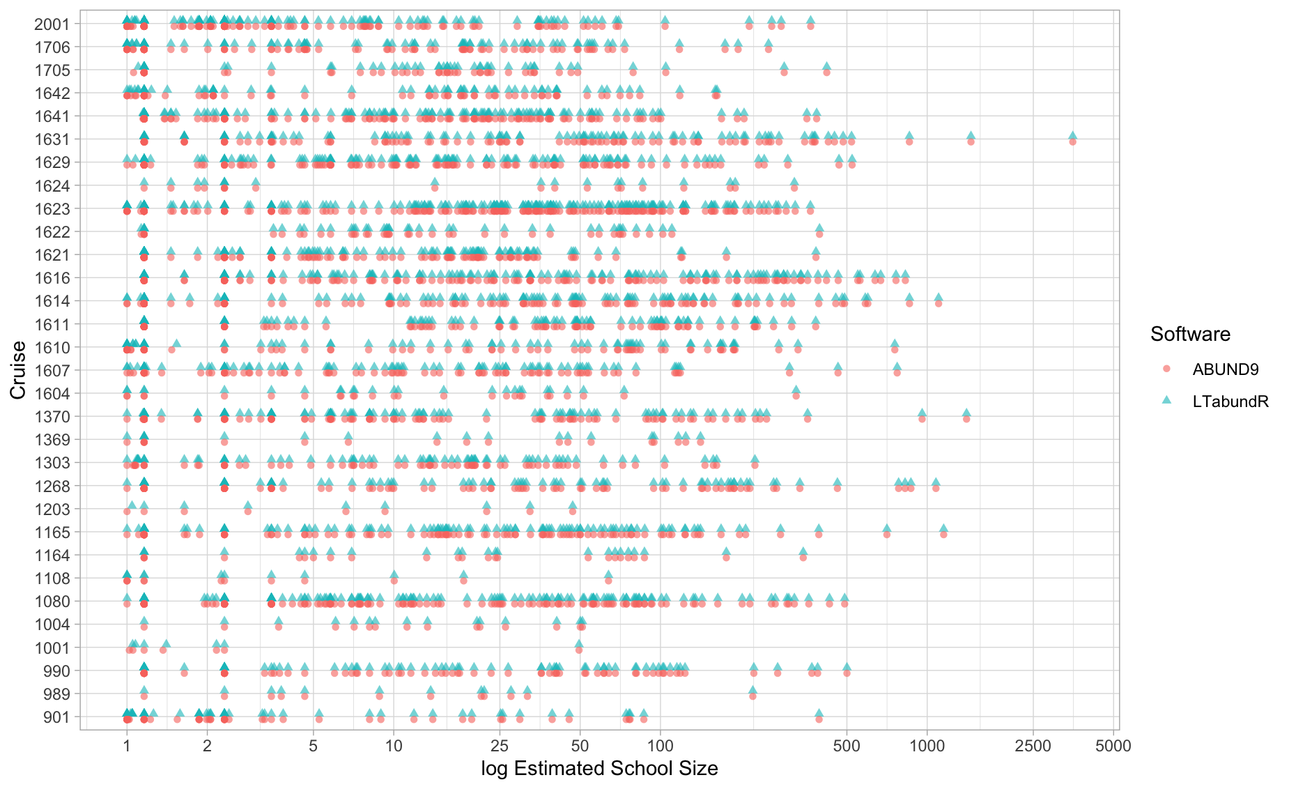 (2) After loading the data, LTabundR removes rows with invalid Cruise numbers, invalid times, and invalid coordinates. As far as we can tell, ABUND does not remove such missing data. This is a relatively minor point; in processing the 1986-2020 data (623,640 rows), 287 rows are missing Cruise info; 1,430 are missing valid times; and 556 are missing valid coordinates, for a total of 2,273 rows removed out of more than 625,000 (0.3% of rows). Many of these rows with missing data have the exact same coordinates and timestamps as complete rows nearby, since WinCruz can sometimes produce multiple lines at the same time when setting up metadata for the research day, which means that this row removal will rarely, if ever, effect total effort calculated.